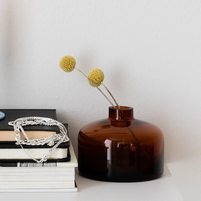 Puhaltamalla valmistettu kaunis Ambra vaasi. Lasissa voi esiintyä kuplia ja epäsäännöllisyyksia. Väri ihastuttavan kullanruskea.