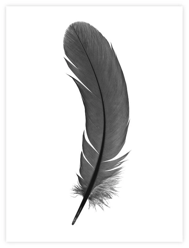 Juliste, jossa tyylikäs musta höyhen. Tämä höyhenjuliste on yhtä kaunis hyllyssä nojautuneena itsekseen seinää vasten, kuin myös tauluseinällä muiden taulujen kanssa. Taulu sopii niin olo-, työ kuin makuuhuoneeseen.