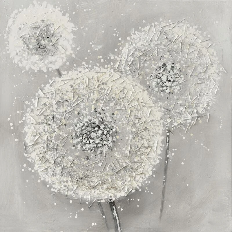 Vaaleilla voikukilla tyylitelty öljyväritaulu. Näyttävillä ja kookkailla tauluilla ilmeen uudistus on helppoa. jonka ansiosta se luo kauniin asetelman seinälle ja koko tilaan. Sopii hyvin olohuoneeseen tai kodin oleskelutiloihin.