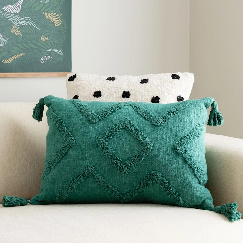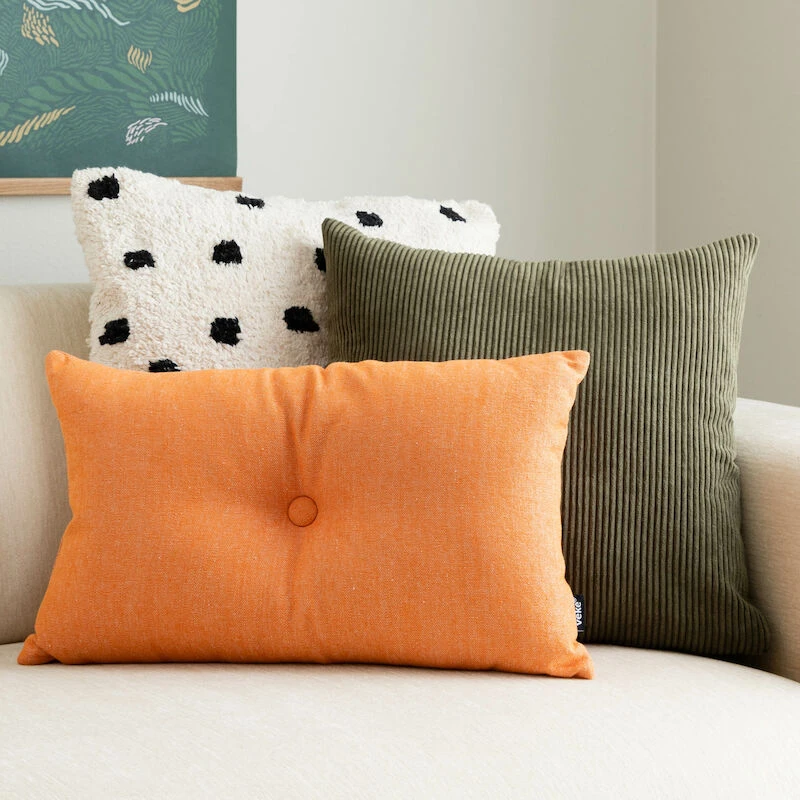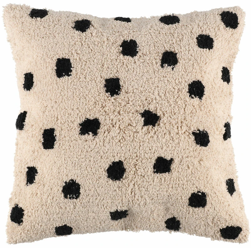 Fanni K Spot koristetyyny on 50×50 cm kokoinen. Tyyny on tuftattu ja siinä on pilkkukuvio. Toinen puoli on sileää puuvillakanvaasia. Päällinen on irrotettava. Pilkkukuviolla saa helposti kotiin ekstra ilmettä ja piristystä.