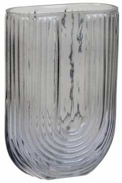 Kaunis savunharmaa lasivaasi, jossa on kaareva koristekuvio U-kirjaimen muodossa. Kaunis kukka-asetelmille tai sellaisenaan koriste-esineeksi.