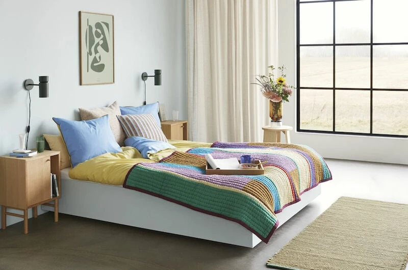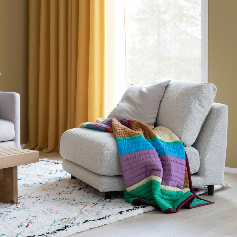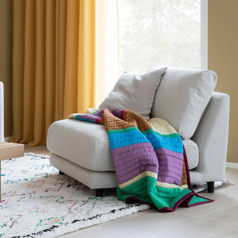 Hübschin 140×200 cm kokoinen Pavilion torkkupeitto on retrohenkinen. Peitossa yhdistyy monta kaunista syksyistä sävyä yhteen. Täydellinen sekoitus beigeä, sinistä, ruskeaa, vihreää, violettia, punaista, valkoista ja keltaista. Peiton ulkoasu on ihanan muhkea. Peitto on 80% puuvillaa ja 20% polyesteriä.
