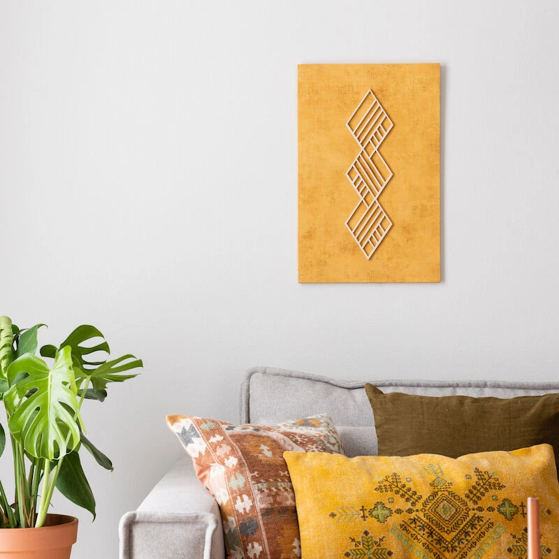Tyylikäs ja moderni kotimainen Boho Vinouma taulu. Taulun kolmiulotteinen koivukuviointi ja kohokuvioinen tausta tuovat tauluun syvyyttä. Taulun materiaalina on käytetty kotimaista koivuvaneria ja hyvin ääntä eristävää taustalevyä. Taustana on kohokuvioinen kuitutapetti ja taulun kiinnittämiseen messinkinen ripustin. Tyylikäs taulu sopii monenlaisten tilojen sisustamiseen. Yhdistämällä erivärisiä tauluja saat näyttävän kokonaisuuden.