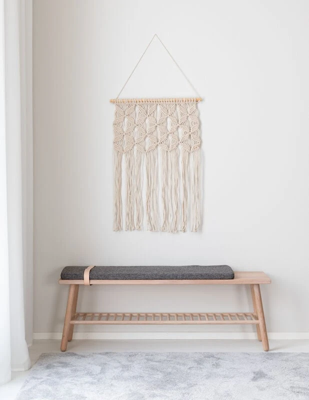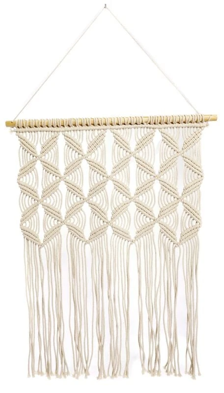 Kaunis luonnonvalkoinen Makrame-seinävaate. Ripusta koristeeksi sängyn päätyyn tai katseenvangitsijaksi kodin paraatipaikalle. Sopii monenlaiseen sisustukseen.