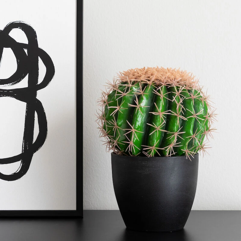 Pallonmuotoinen kaktus tekokasvi mustassa mattapintaisessa ruukussa. Tekokasvin halkaisja on noin 17 cm ja korkeus 26 cm.