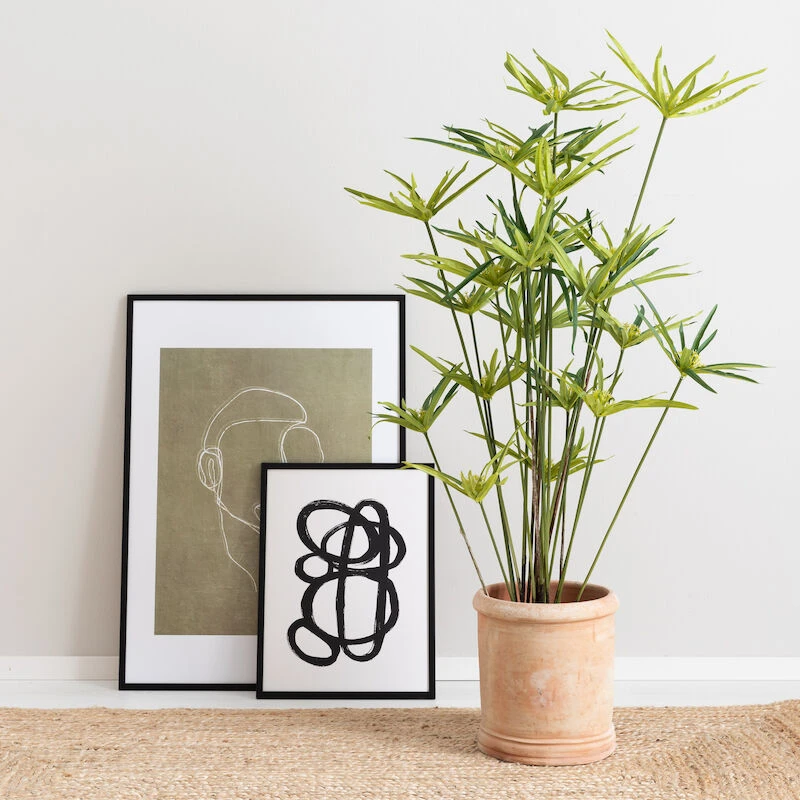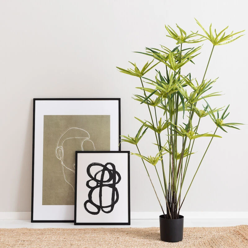 Kaunis tekokasvi Sädekaisla Cyperus. Lehtien lukumäärä kasvissa on 22kpl. Tuote toimitetaan pienessä mustassa istutusruukussa.