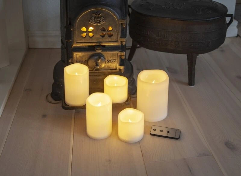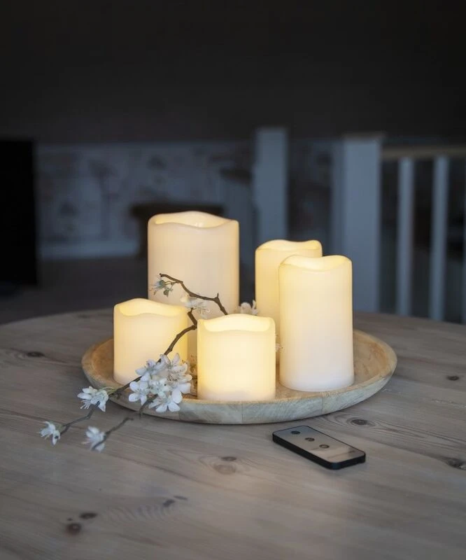 Kaunis norsunluunvalkoinen LED-kynttiläsetti sisä-tai ulkokäyttöön. Setti sisältää 5kpl erikokoisia kynttilöitä. Mukana toimitetaan kauko-ohjain, jolla kynttilät voi sytyttää ja sammuttaa. Kynttilät on myös mahdollista ajastaa palamaan kuuden tunnin ajan kerrallaan. Kynttilöissä on kiinteä LED, jonka paloaika on noin 5000h. Kynttilät toimivat yhteensä kymmenellä AA-paristolla, jotka eivät sisälly toimitukseen. Kaukosäädin toimii CR2032-paristolla, joka sisältyy toimitukseen mukaan. Kynttilän IP44. Setissä olevien kynttilöiden koot: 2kpl 7,5 x 7,5 cm, 2kpl 7,5 x 12 cm ja 1kpl 10 x 15 cm.