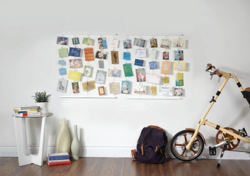 Monipuolinen Umbra Hangit valokuva- ja muistitaulu, tilaa 40 kuvalle, piirrokselle, muistilapulle tai pienille taideteoksille. Listojen välissä kulkee 5 narua joihin kiinnitetty 40 minipyykkipoikaa kuvien kiinnitykseen. Ihanteellinen makuuhuoneen, kotitoimiston, olohuoneen ja keittiön sisustamiseen. Voidaan asentaa pysty- tai vaakasuoraan. Tuotteessa on luonnonpuiset seinäpidikkeet, poikkeuksena metalli väri. Pakkaus sisältää ruuvit.
