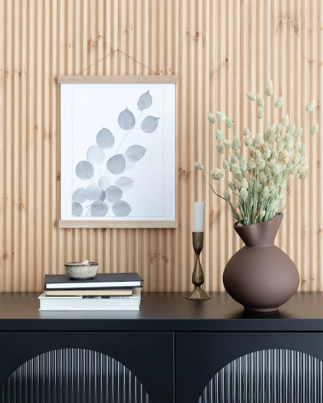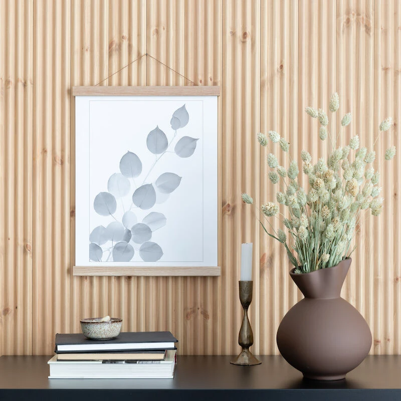 Helppokäyttöinen julistekehys magneetilla. Päivitä sisustuksen ilmettä helposti vaihtamalla . Juliste kiinnittyy kahden puisen riman väliin magneettien avulla. Kehyksessä ripustuslenkki, jonka pituus 48 cm. Materiaalina puuvalmis tammi sekä maalattu saarni valkoisessa ja mustassa.