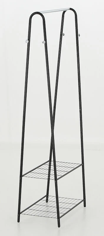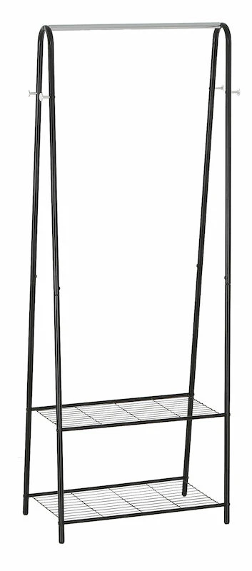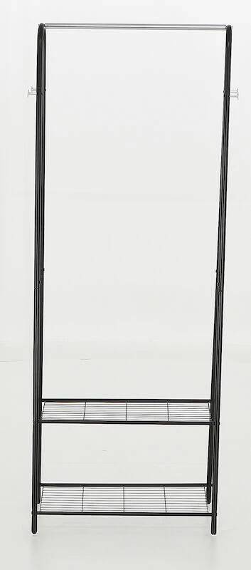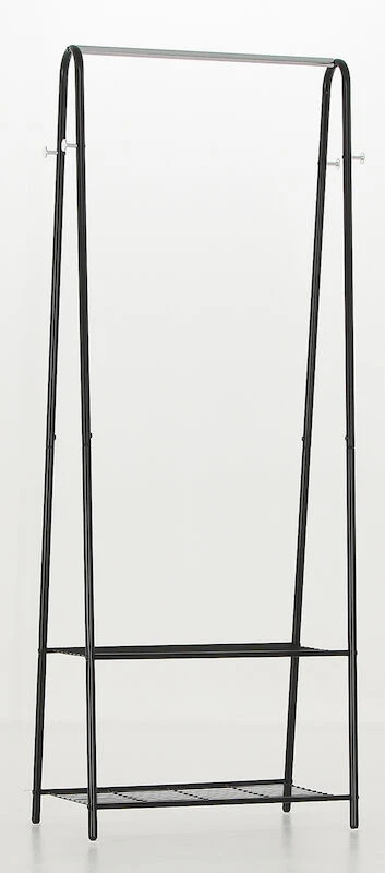 Kevyt ja helposti siirreltävä Oksa vaateteline on helppo sijoittaa siron kokonsa vuoksi eteiseen tai vaikkapa pukeutumishuoneeseen. Vaatetelineeseen saat vaatteet siististi henkariin ja kengät järjestykseen alaosan kahdelle hyllylle. Vaatetelineen molemmilla sivuilla on nupit, joille voi nostaa vaikkapa laukun helposti käden ulottuville. Pulverimaalattu vaateteline on 65 cm leveä ja 161 cm korkea, joten se mahtuu pienempäänkin tilaan. Nupit sekä henkaritanko ovat kromin väriset.