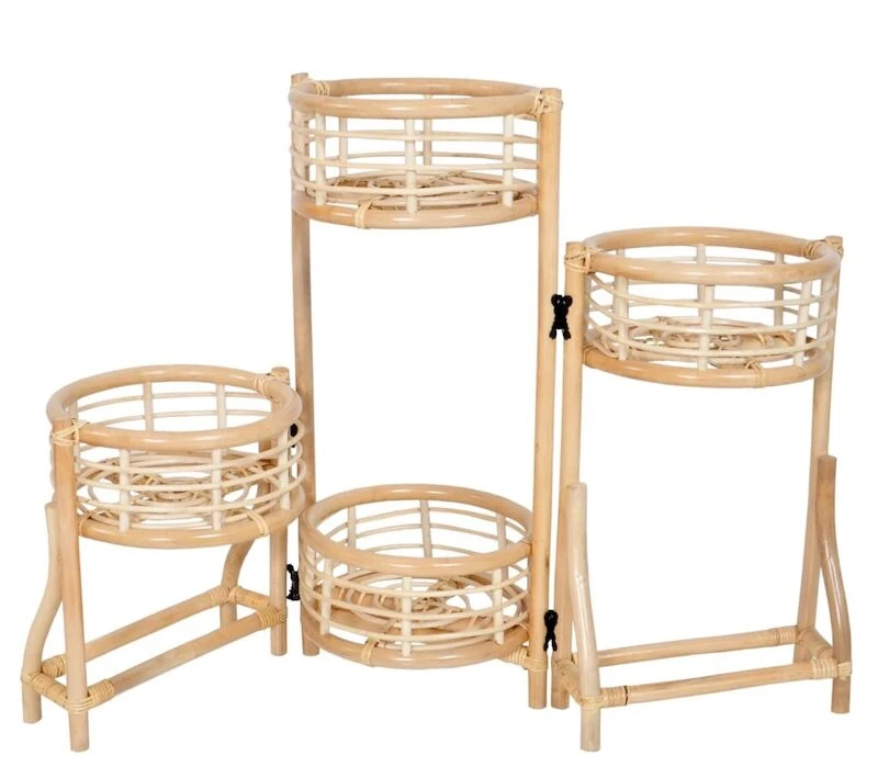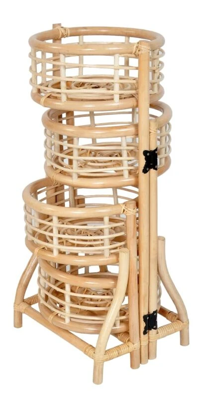 Rottinkinen 3-osainen kukkateline, joka taitettavissa helposti pienempään tilaan. Yhden pyöreän osan halkaisija on noin 30 cm. Tuote toimitetaan valmiiksi kasattuna, joka avataan vain haluamaansa asentoon. Rottinki on ekologinen luonnonmateriaali ja sen ominaisuuksiin kuuluu värivaihtelut ja tummemmat kohdat. Värivaihtelut, epätasaisuudet ja käsityön jälki tekevät jokaisesta rottinkituotteesta yksilöllisen. Rottinki patinoituu ajan saatossa. Yhden tason kantavuus on 6 kg. Kukkateline soveltuu vain sisätiloihin.