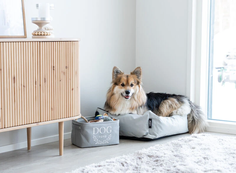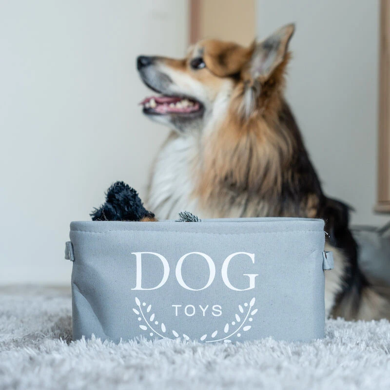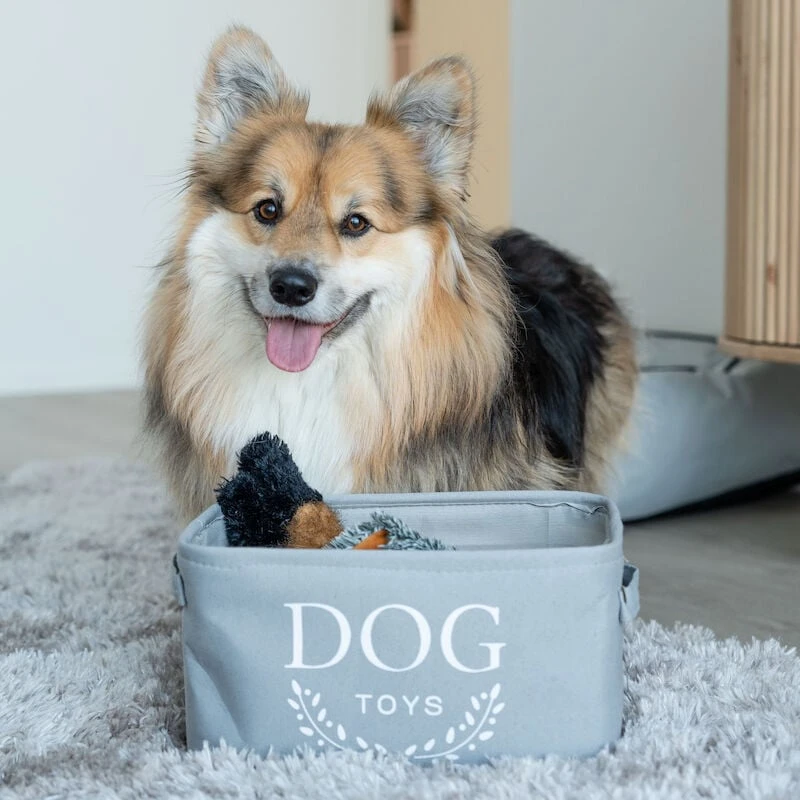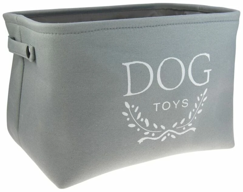 Weisteen harmaakankainen kori kantokahvoilla vaikkapa koiran lelujen säilyttämiseen. Korin kyljessä on teksti Dog toys. Korin koko on 30x20x22 cm
